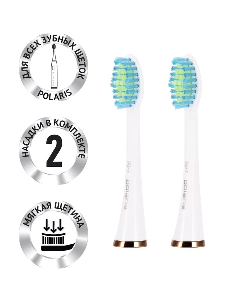 Комплект TBH 0101 S (2) из двух насадок с мягкой щетиной подходит для любой зубной щетки Polaris.Мягкая щетина рекомендована для чувствительной эмали и десен.