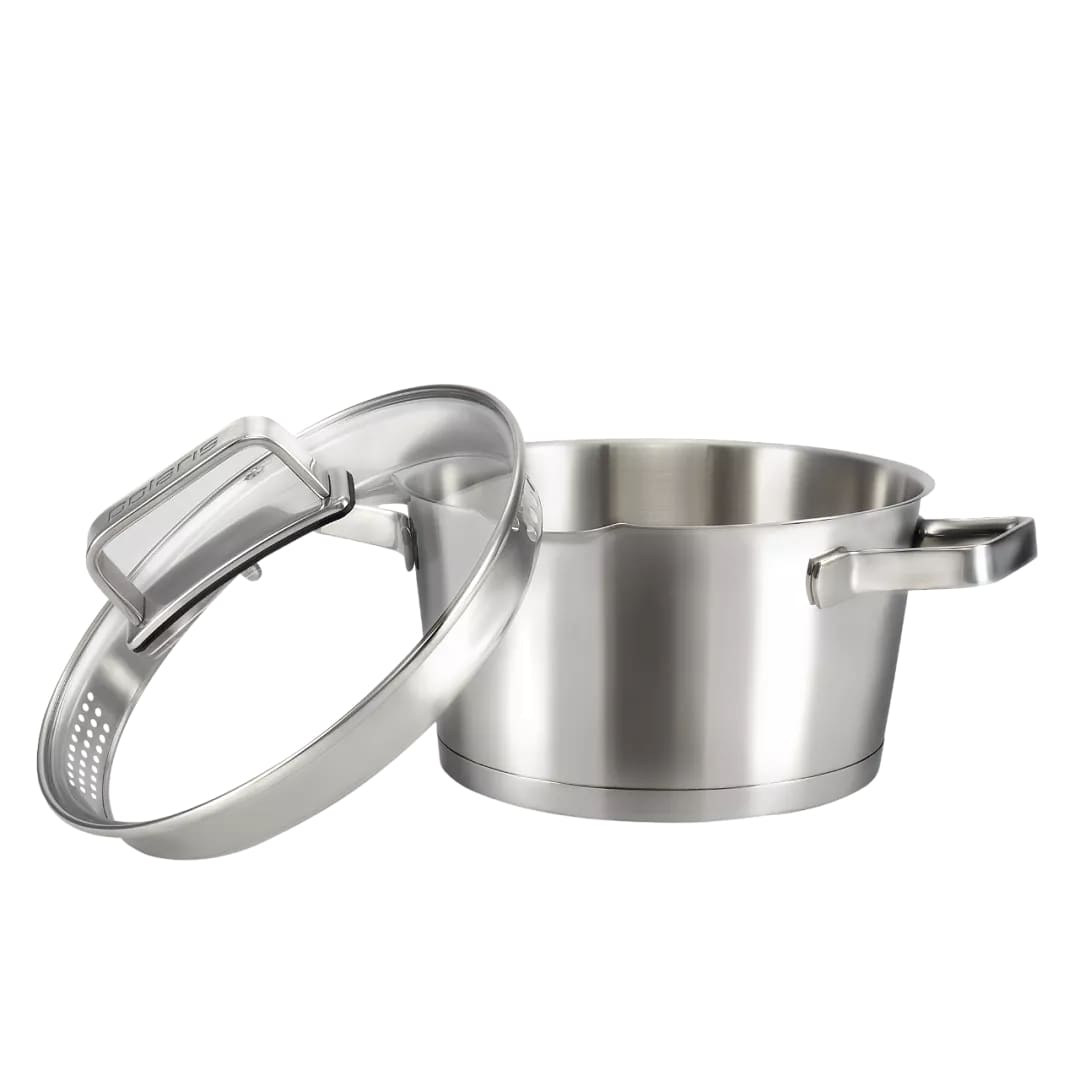 Крышка из жаропрочного стекла с отверстием для выпуска пара и специальным широким металлическим ободом с отверстиями для удобного слива жидкости.
