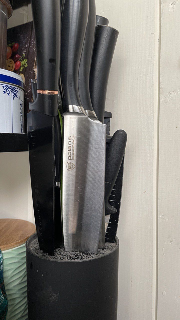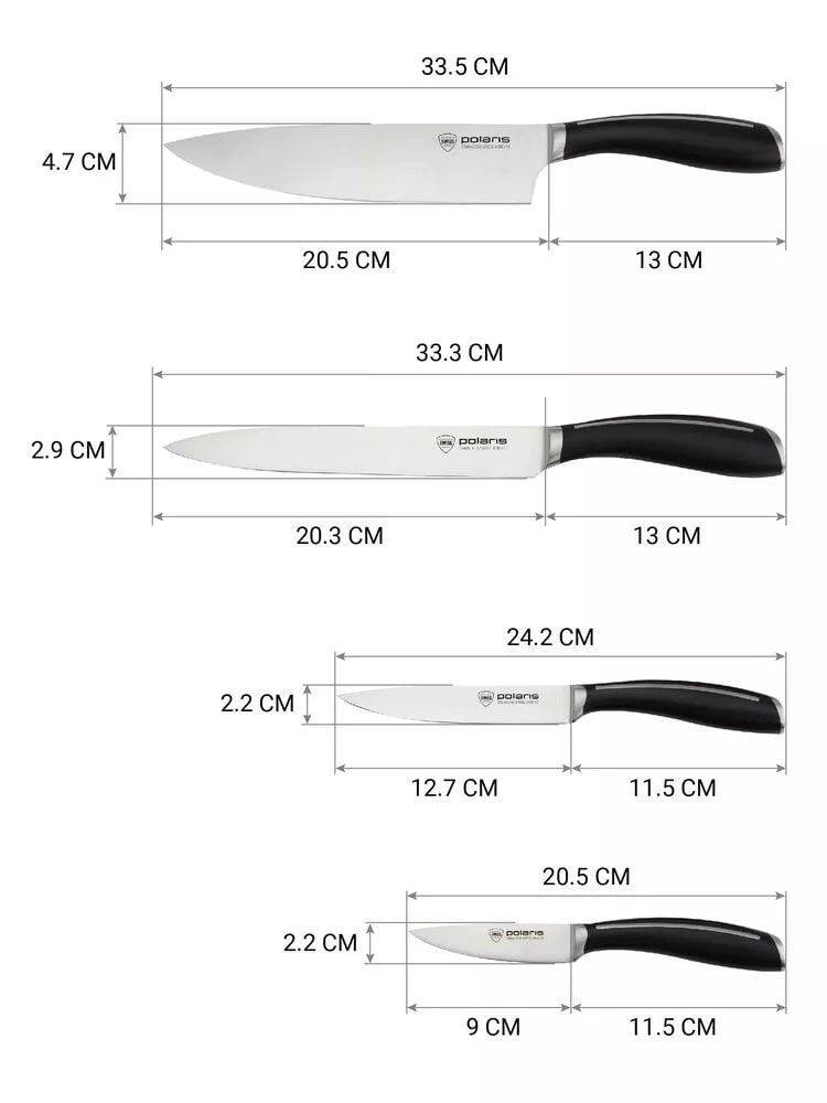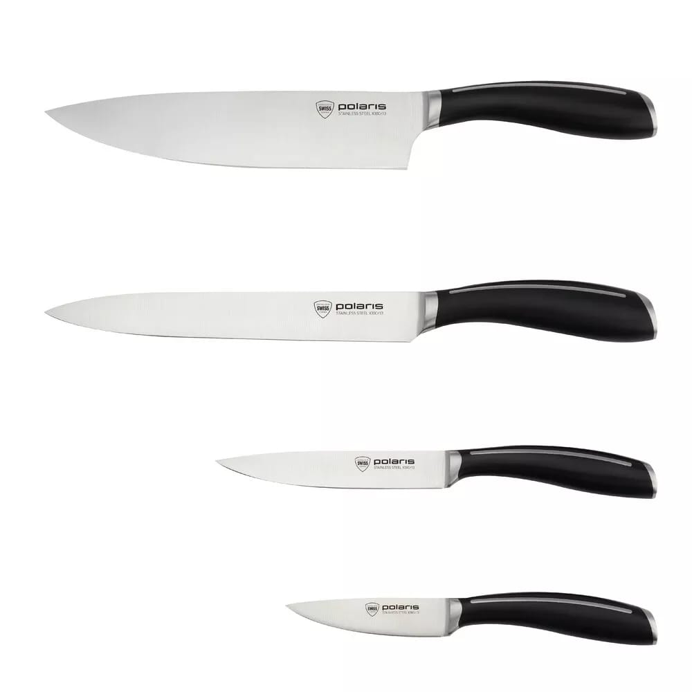 Твердость ножей по шкале Роквелла составляет 54±2 HRC, что гарантирует их высокую сопротивляемость деформации. Кроме того, форма рукоятки ножей специально разработана с учетом эргономики, чтобы предоставить вам максимальный комфорт во время работы на кухне. Все лезвия ножей Polaris тестируются на отсутствие дефектов, чтобы убедиться в соблюдении технологий при изготовлении. Для сохранения этих особенностей, мы не рекомендуем мыть ножи из нержавеющей стали в посудомоечной машине.